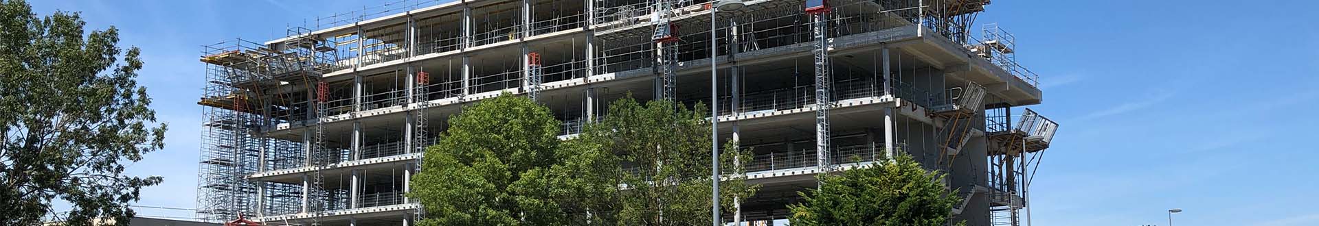 Socramat Fabrication fournit les poutres sur-mesure pour l’ensemble des intérieurs et périphérie du bâtiment. Pour permettre le déport architectural, des éléments monobloc intégrant la rive en porte-à-faux ont été étudiés puis fabriqués dans notre usine de préfabrication lourde. Le gain de temps en coffrage est indéniable sur le chantier.
